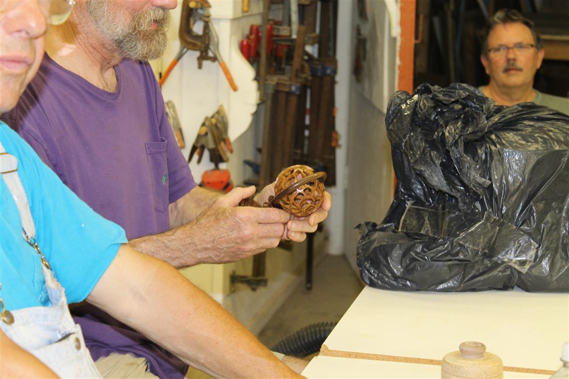 We welcomed Graeme to the meeting and he joined us at the Show and Tell, even displaying and passing around some of his work. Tony brought an interesting piece of pierced work that displayed great technical skills. Richard is seen here evaluating Tony’s sphere.Once again, our photographer didn’t show up so we’ll have no pictures for this entry. Please feel free to volunteer for the unofficial title…