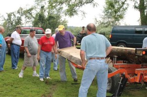 Now that the log has been loaded on the mill, life gets easier! Dick is operating the mill with a tremendous amount of supervision…I think Peter is from OSHA?