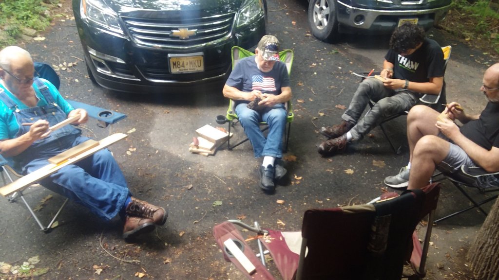 Wil and Carl arrived a few minutes later. Carl had his son Daniel in tow, and after a few minutes of demonstrating, everyone got a knife and some wood and we just got carving.