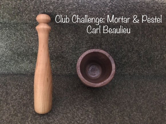 Mortar is made of walnut and the pestle of maple. I turned the mortar with a lip, that I then carved away except for the part that I shaped into a spout that allows ground spices and grains to be accurately poured from it.