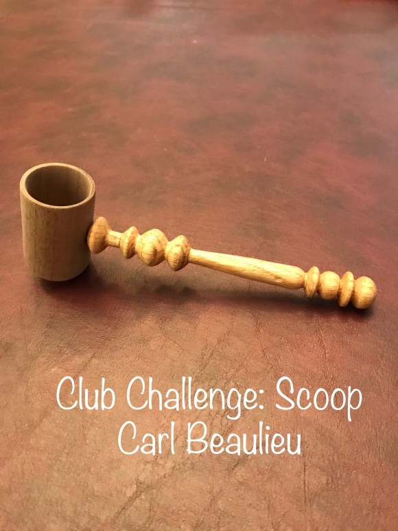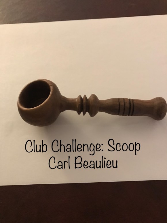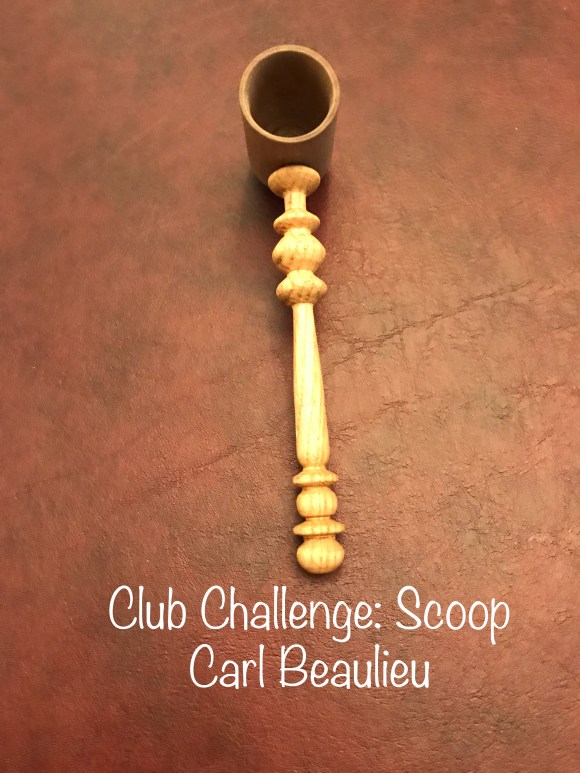 Carl Beaulieu — Coffee Scoop #1 made from 2×2 x3 1/4 inch walnut, handle from 3/4×3/4 x6 1/2 inch oak scraps. Good learning project for spindle turning.