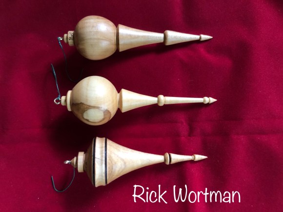 Rick Wortman — Christmas tree ornaments made from a small piece of red maple from the one tree in the yard and had laid for a number of months outside for the mother and grown children who had been raised in that home.