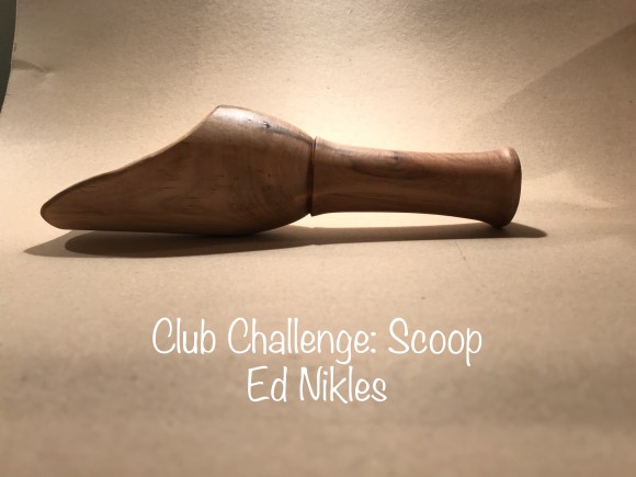 Coffee Scoop #2 has 1 3/4 “ bowl with 6 inch handle. Turned as a spindle and bowl turned in donut fixture. Made from 2 inch square by 7 inch walnut piece. Most difficult part is turning the ball to form the scoop bowl.
