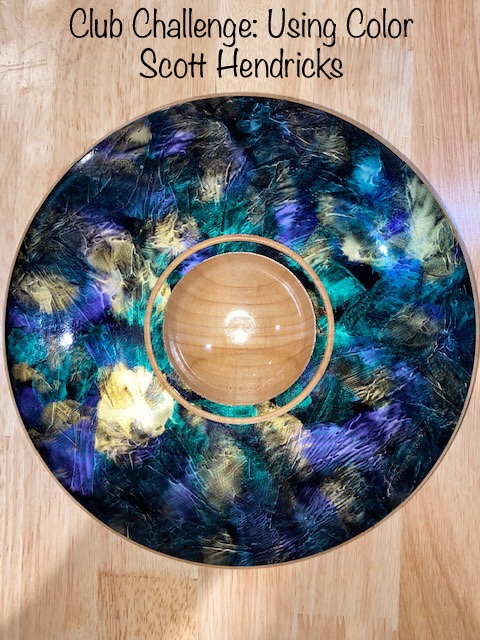 Scott Hendricks — Turn the maple blank. Paint the face flat black. Splash iridescent colored paints. While wet, put plastic wrap on paint and squish with your hand. Cut out the center, ring and edge.