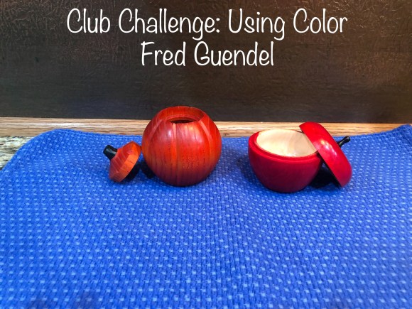 Fred Guendel — Two lidded boxes that blend the Fall theme that Rick Workman suggested and the coloring assignment that Jim gave us. On the left of each photo is a pumpkin, turned frown ash, carved, then colored with orange dye; its finished with shellac and wax. On the right is an Apple, turned from figured maple, carved, then colored with red dye, the finished with shellac and wax. Both are ~3” tall and in diameter.