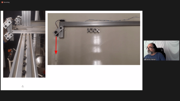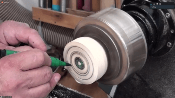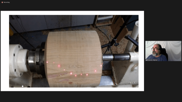 Dennis discussed in detail several jigs and devices he’s created out of extruded aluminum parts to aid in woodturning and sharpening. Of note was an invention that provides a laser-driven “storyboard” guide for the shape he wants to turn. The device is suspended above the lathe – along the center-line of the bed – and uses several inexpensive lasers to project the desired shape on to the wood blank.