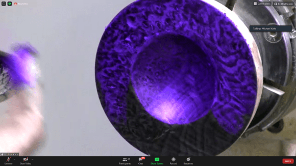 Michael Kehs of the NJ Woodturners gave a demo on what he calls Fire Sanding and Coloring via Zoom on Tuesday July 14. This decorative process entails charring the wood of a turned object with a torch then wire brushing, polishing and finally adding a pop of color with guilders/accent paste. The resulting contrast of color against blackened grain is stunning. Michael uses this technique to not only add interest to plain or ordinary woods like poplar, ash and pine but also applies it to woods recognized for their natural beauty – like burls – with spectacular results.