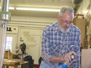 We welcomed Graeme to the meeting and he joined us at the Show and Tell, even displaying and passing around some of his work. Tony brought an interesting piece of pierced work that displayed great technical skills. Richard is seen here evaluating Tony’s sphere.Once again, our photographer didn’t show up so we’ll have no pictures for this entry. Please feel free to volunteer for the unofficial title…